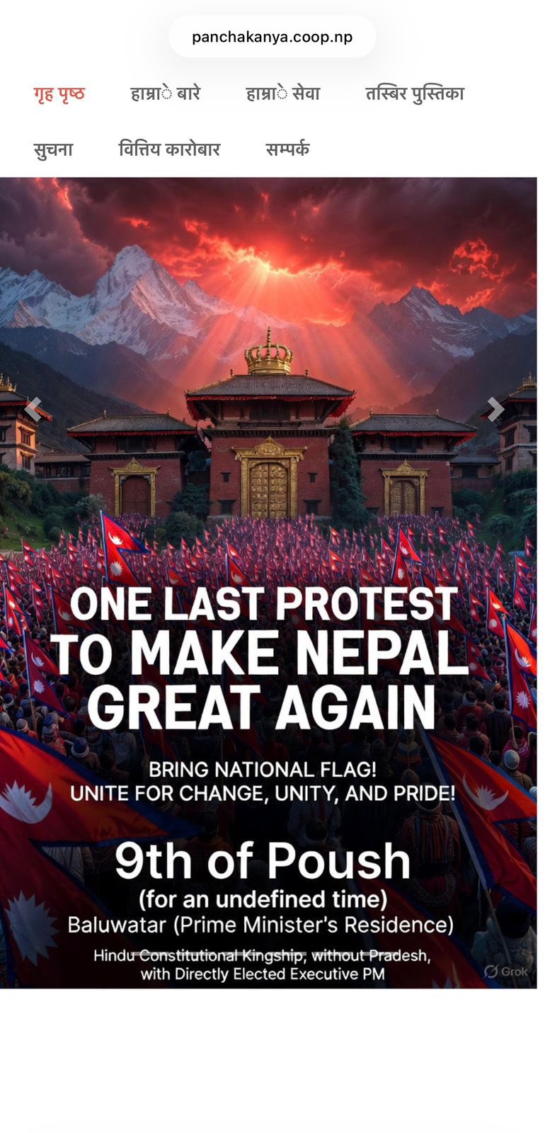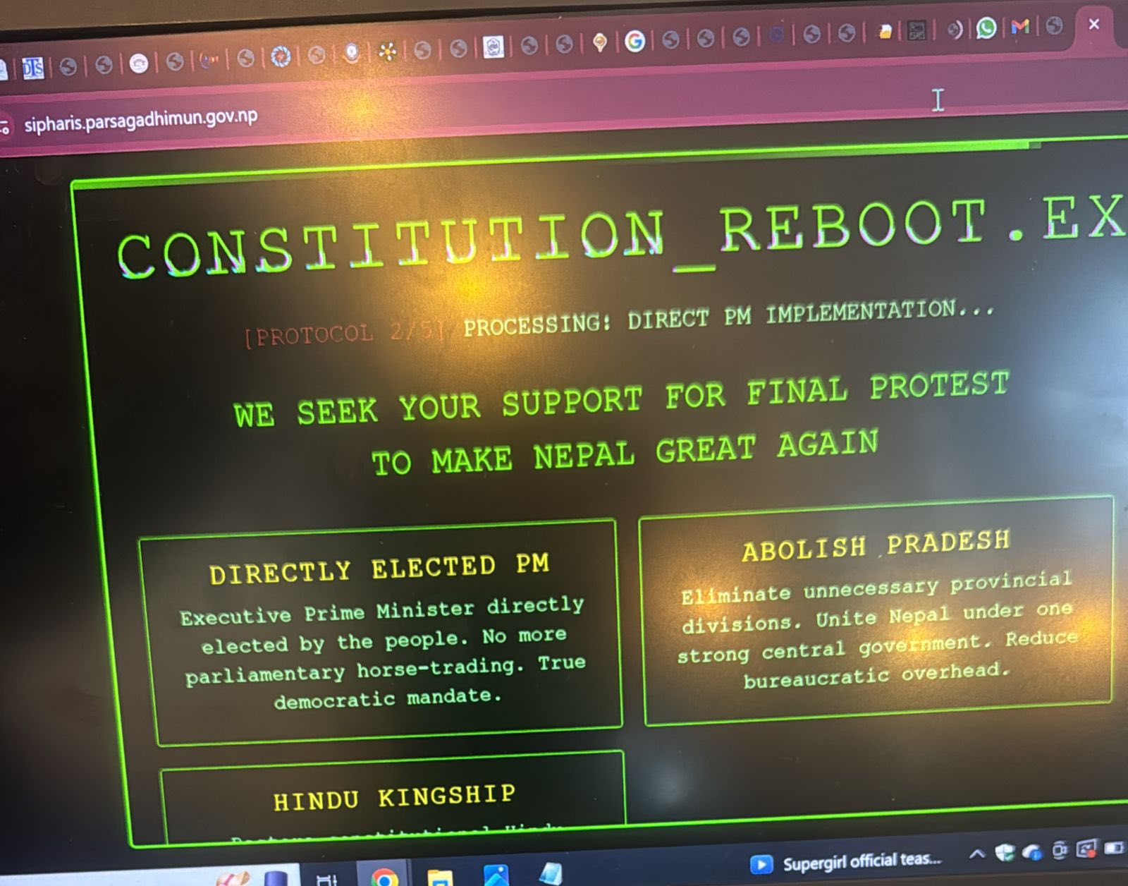 काठमाडौं, पौष १, २०८२ मंगलवार- विभिन्न सरकारी तथा गैरसरकारी वेबसाइटहरूमा साइबर हमलाको माध्यमबाट संवैधानिक हिन्दू अधिराज्य स्थापना, प्रदेश संरचना खारेज तथा प्रत्यक्ष निर्वाचित प्रधानमन्त्री प्रणालीको मागसहित पौष ९ गतेदेखि ‘अन्तिम आन्दोलन’ सुरु गर्ने घोषणा गरिएको छ।