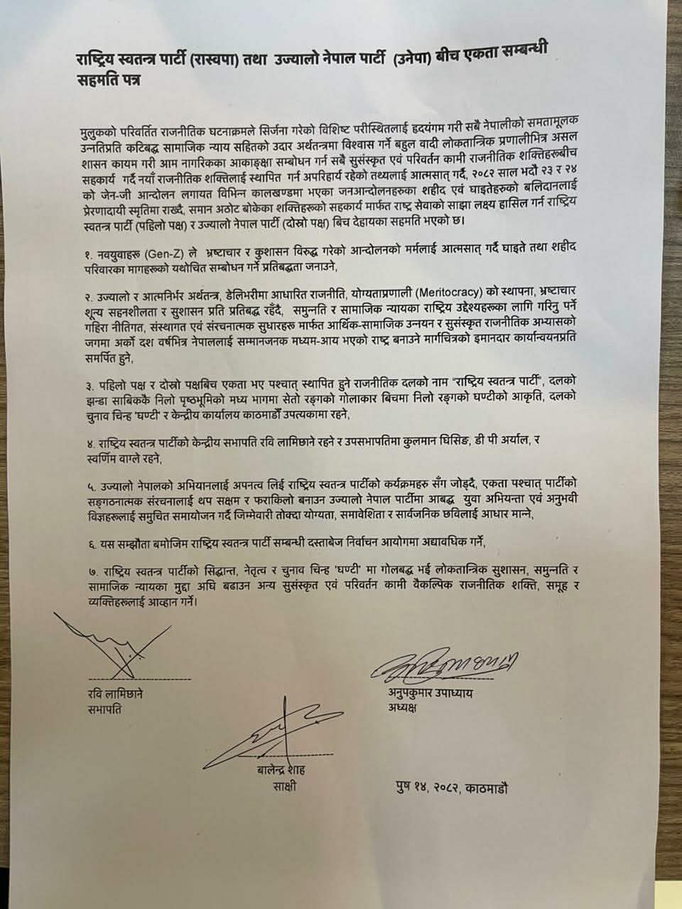 सोमवार १४ पुस २०८२ काठमाडौं । राष्ट्रिय स्वतन्त्र पार्टी (रास्वपा), बालेन शाह र कुलमान घिसिङ अन्तत: एक ठाउँ उभिएका छन्।