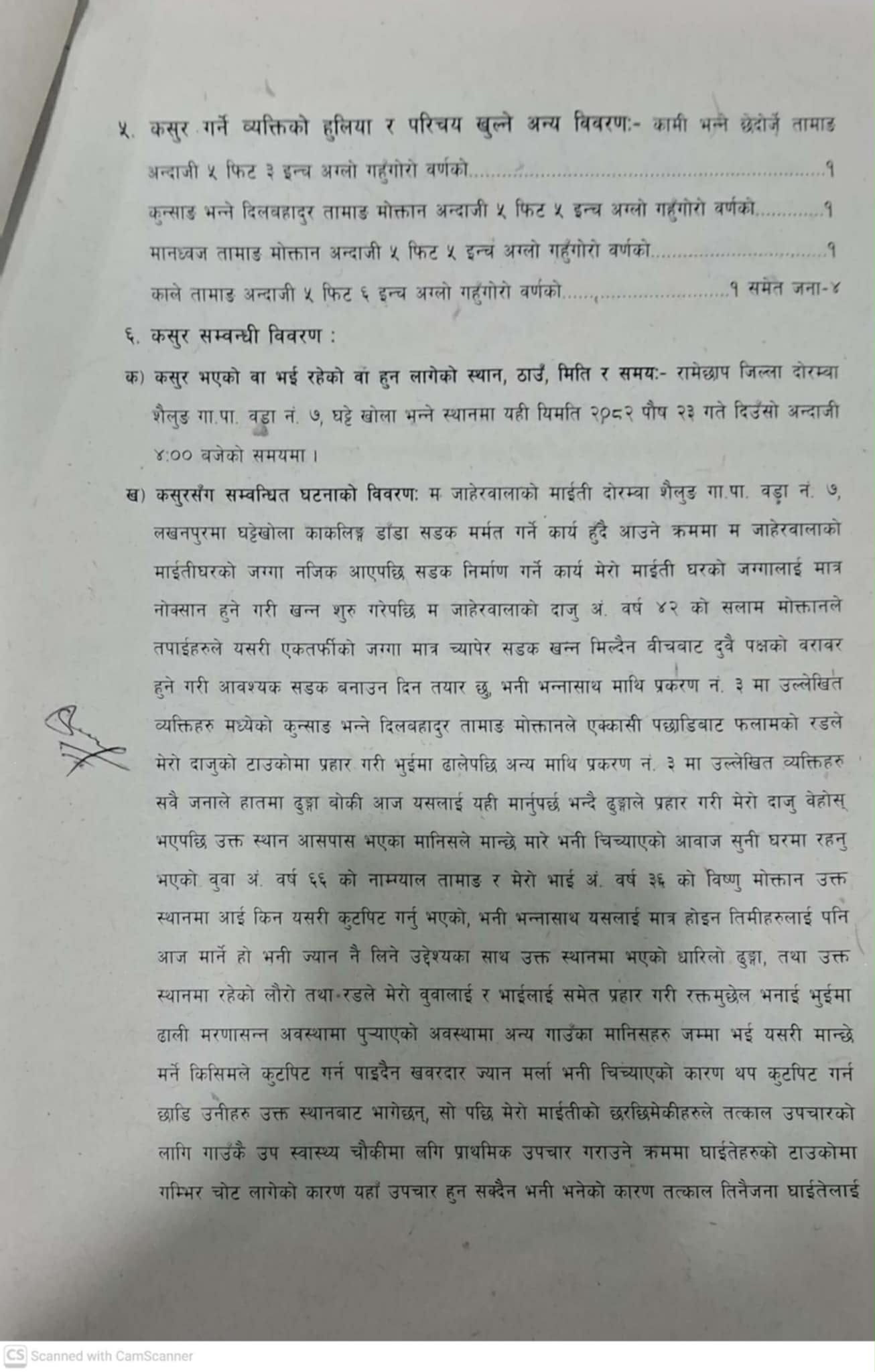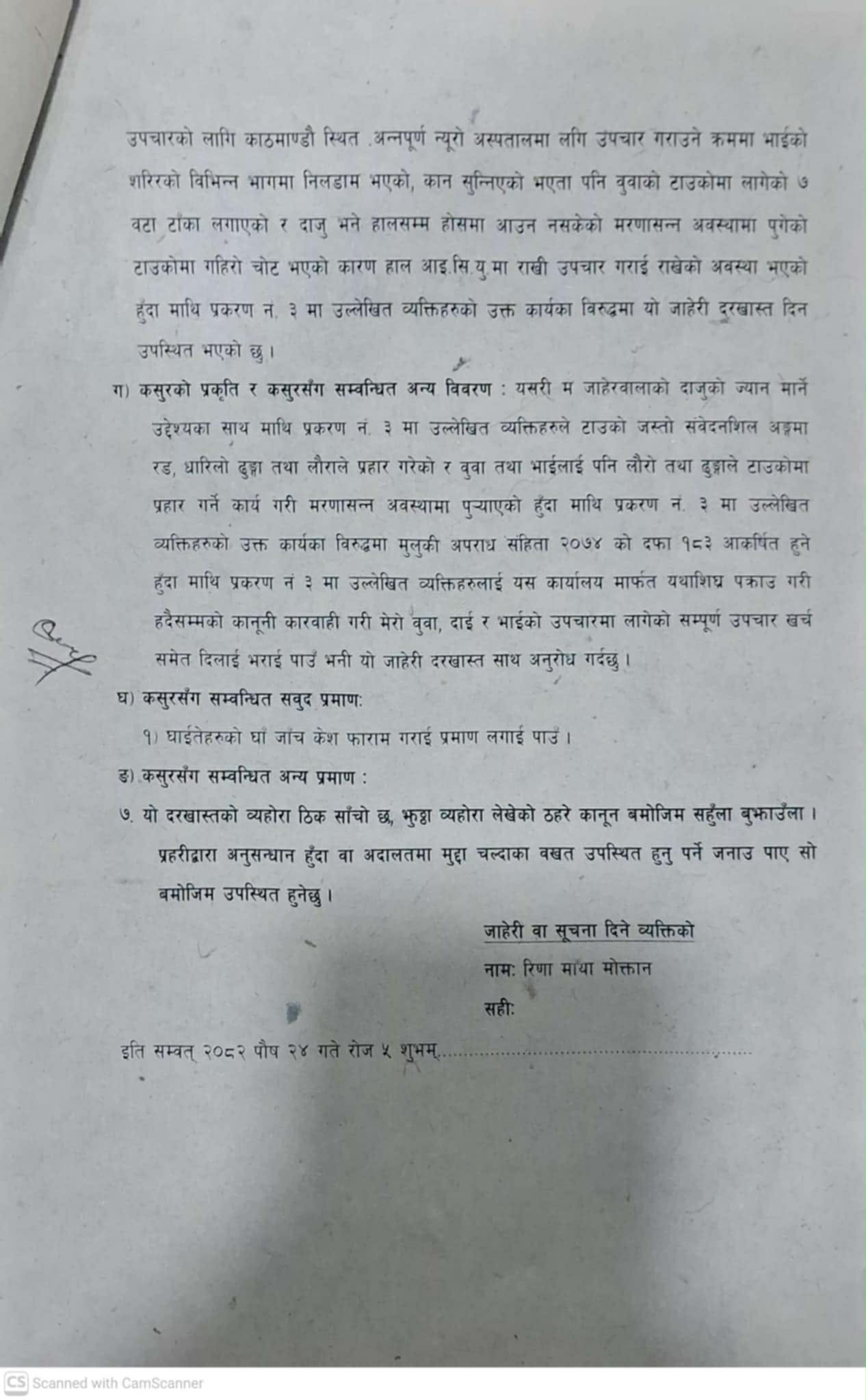 यस्तो छ घाईते सलाम मोक्तानको बहिनि रिणा माया मोक्तानले जिल्ला प्रहरी कार्यालय रामेछापमा दिएको जाहेरि