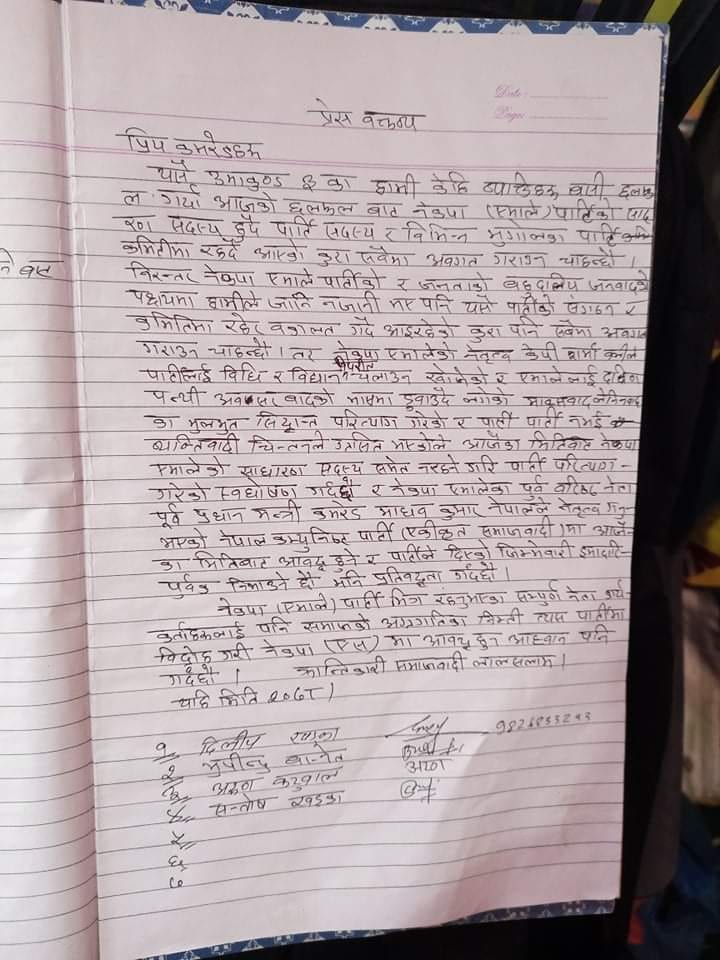 एमाले बिद्रोहगरि नेकपा (एकीकृत समाजवादी) मा प्रवेश गरेका व्यक्तिहरुको प्रेस वक्तब्य निम्न रहेको छ।