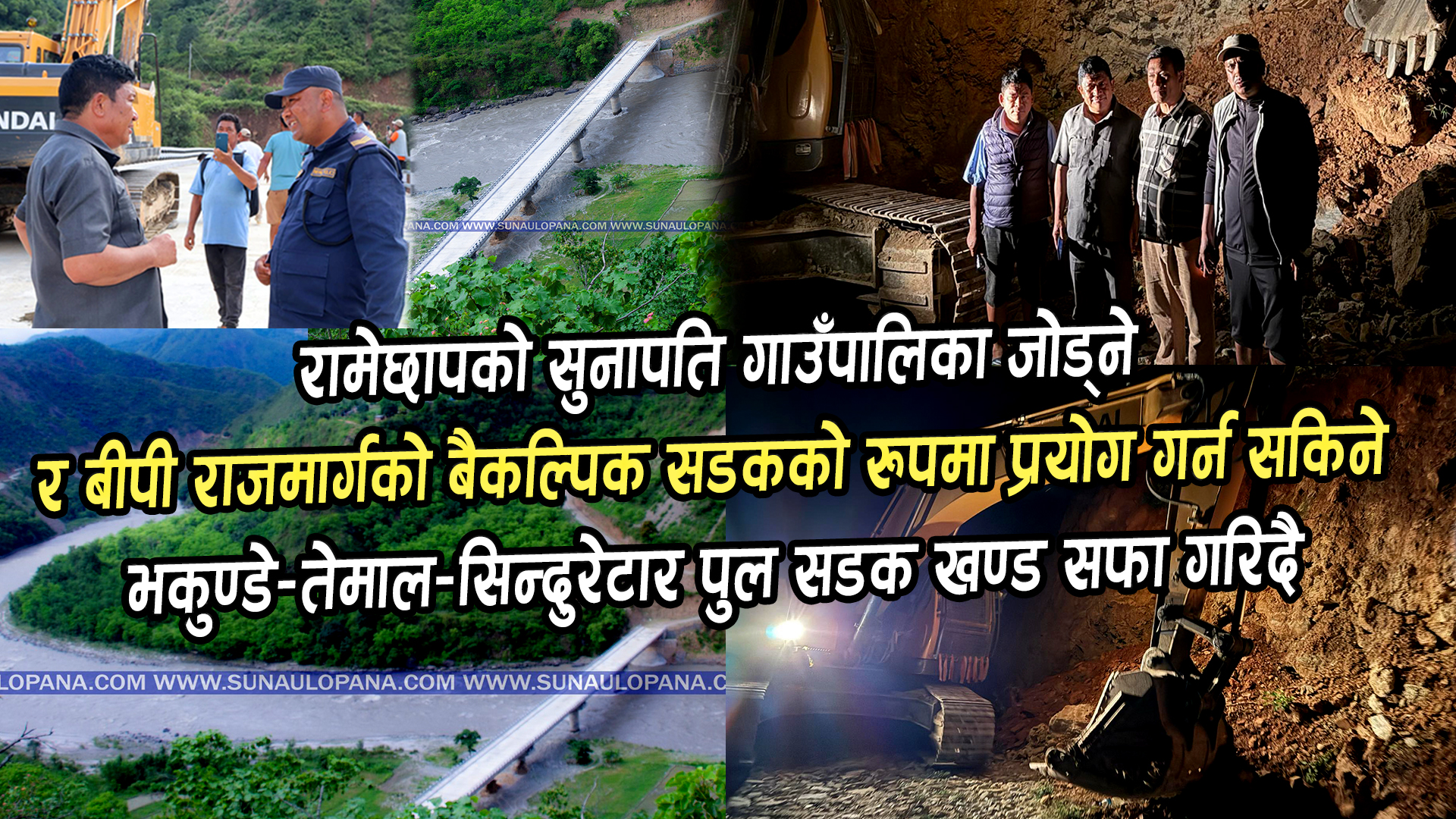 १८ असोज २०८१, काठमाडौँ।-रामेछाप (सुनापति गाउँपालिका) र काभ्रे (तेमाल गाउँपालिका) जोड्ने सिन्दुरेटारको पुलबाट सवारी साधन आवतजावत गर्नकोलागि सुनापति गाउँपालिकाका अध्यक्ष ठूलो कान्छा तामाङको नेतृत्वमा पालिकाको स्काभेटर लगेर अहिले सिन्दुरेटारको पुलबाट मेच्छे पौवा डाँडाँतर्फ सडक सफा भैरहेको छ भने तेमाल गाउँपालिकाका उपाध्यक्ष सालमान थोक्करको नेतृत्वमा मेच्छे पौवा डाँडाँबाट पुलतर्फ सडक सफा भईरहेको छ। सम्भव भएसम्म आज रातभरि नै सडक सफा गर्ने गरि काम भईरहेको सुनापति गाउँपालिकाका अध्यक्ष ठूलो कान्छा तामाङले बताएका छन।